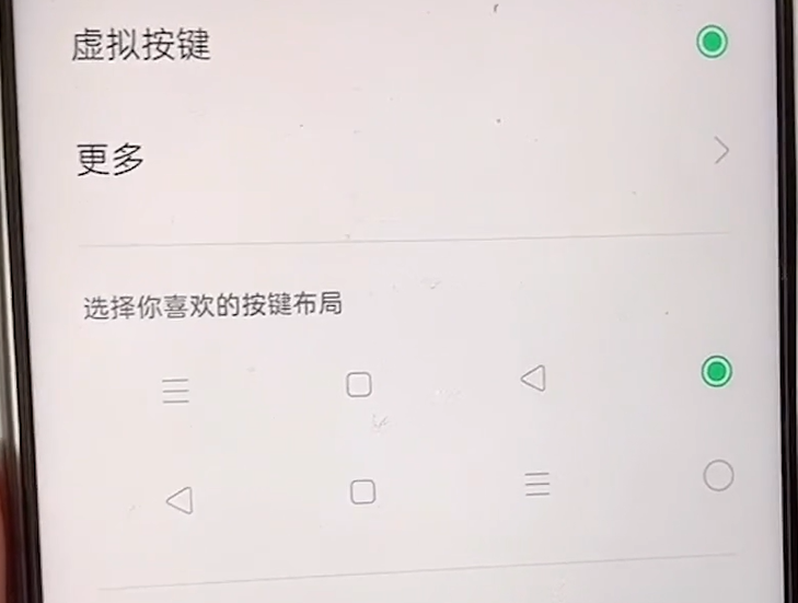 咱们点击进来,点击进来以后可以看到这儿有一个虚拟按键,咱们就选虚拟按键,接下来这儿就出现了三个我们想要的个小标志,你可以把返回键放在最右边儿,也可以把返回键放到最左边儿,看你自己喜欢哪个方式。