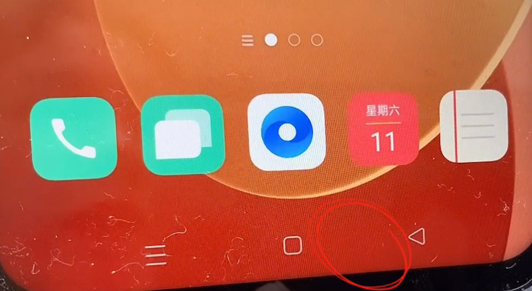 如果你手机的返回键突然消失了,再也找不到了,应该如何把它找回来?我说的手机的返回键就是这个键,就是我用圈儿圈出来的这个它一般就是在手机的最下边儿,如果说我们要返回某个界面,我们就点这个,它就返回了,但是有时候,这个键就消失了,就变成了这个样子,就是变成了这个样,就是下边儿没有这三个键了,怎么找也找不到。