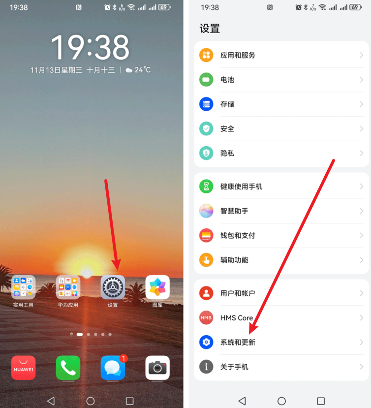1、在手机上找到并点击【设置】,然后在设置中找到并点击【系统和更新】,一般在最底部;