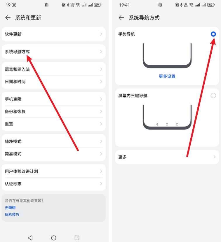 2、接着我们再点击【系统导航方式】,然后我们就能看到默认是使用的【屏幕内三键导航】,如果我们要隐藏三个键,只需要选择上方的【手势导航】就可以了,如下图所示: