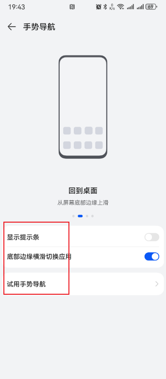 细心的朋友会发现“手势导航”下方是有一个【更多设置】,你点击进去会发现有三个设置选项,其中就有一个非常适合新手的【试用手势导航】,大家如果想熟练的使用手势导航,个人觉得一点先试用一下,看看自己是否适合哦,以及最上方的手势介绍,如下图所示: