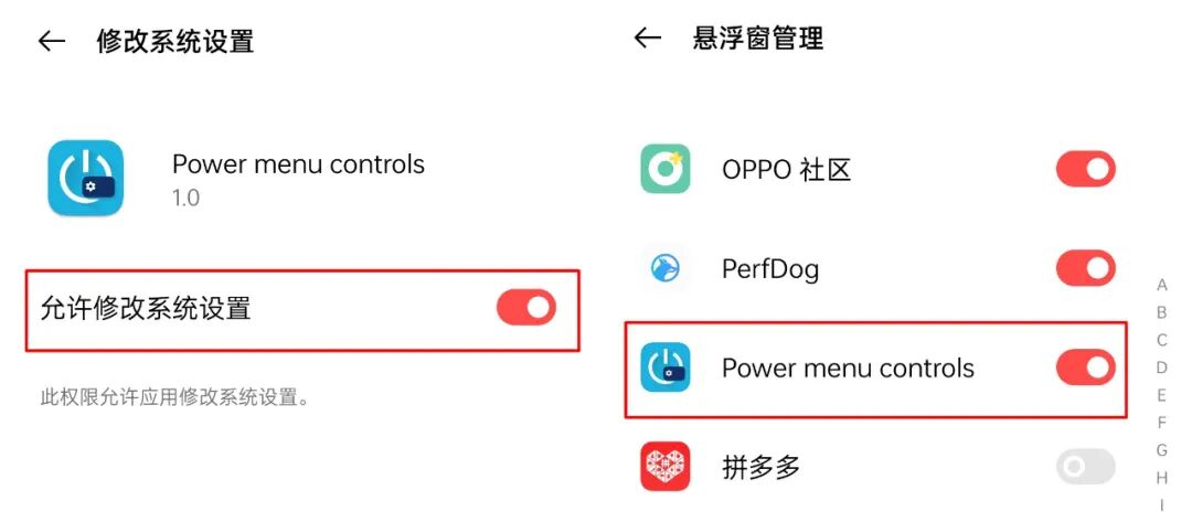 这两个权限分别对应【修改系统设置、悬浮窗】。