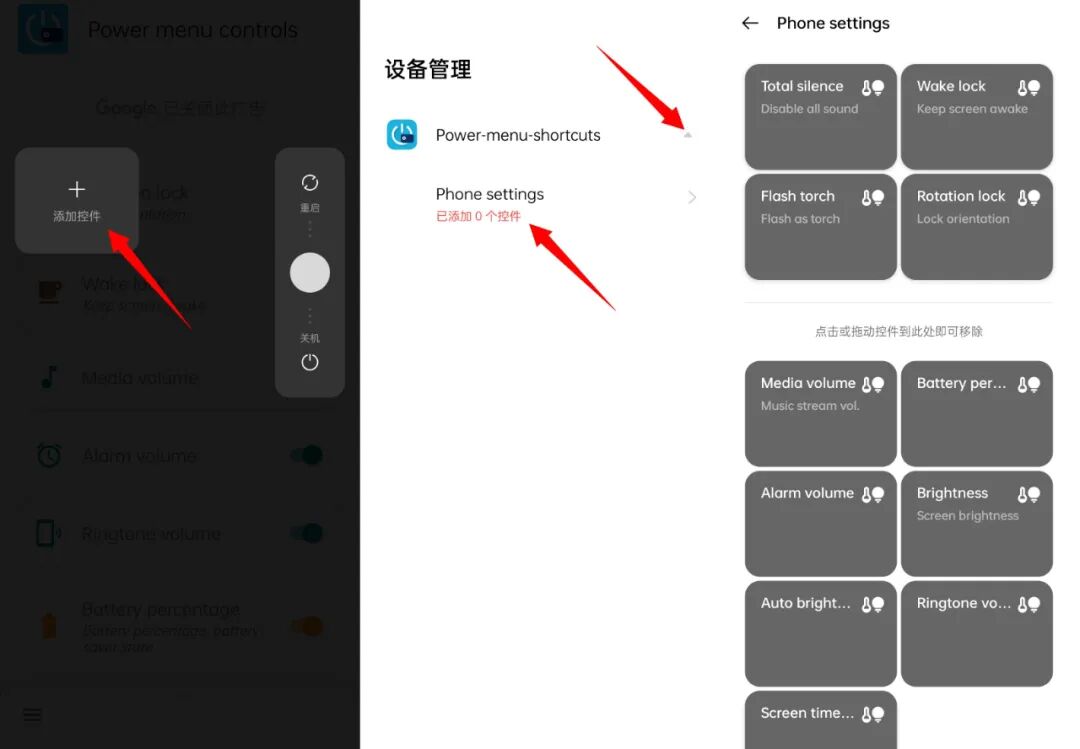 最后,长按电源键,选择【添加控件】,点击三角图标下的【Phone settings】,即可创建电源键快捷功能面板。