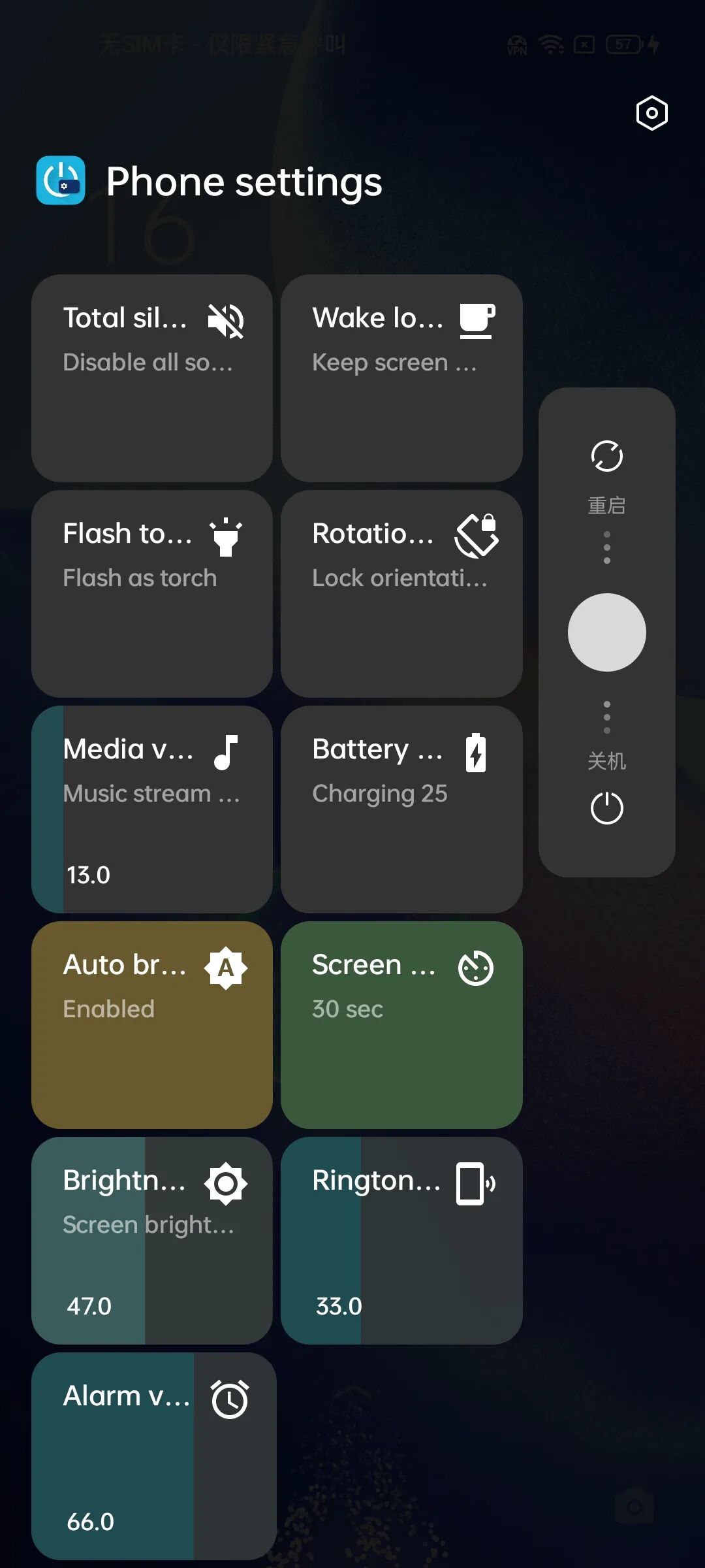 Power menu control 为电源键提供了包括亮度调节、手电筒、静音、旋转屏幕、媒体音量控制在内的 11 个快捷功能。