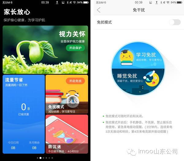 ③也可以为孩子开启免打扰模式,减少孩子在学习的时候其它信息对孩子造成干扰。免扰模式开启之后,手机静音、不亮屏、禁止娱乐应用使用,紧急来电振动提醒。(3分钟内,连续来电3次无振动和响铃,第4次来电亮屏并振动提醒。)此外还有防沉迷功能,即前面提到的imoo助手里面的时间、应用管理。