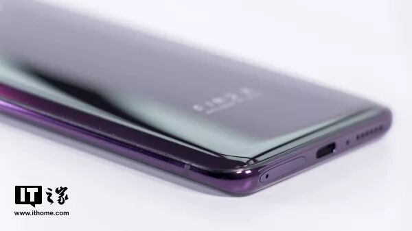 目光沿着手机背部两侧的曲面来到中框。OPPO Find X采用的是7系铝合金中框,由于机身前后双曲面玻璃面板的延展,所以中框在两侧处曲线收窄,这样最大的好处是能够照顾手感。铝合金中框表面做了抛光处理,色泽上和机身背部保持一致,呈深邃的紫红色,中框和前后面板通过塑料缓冲层衔接。